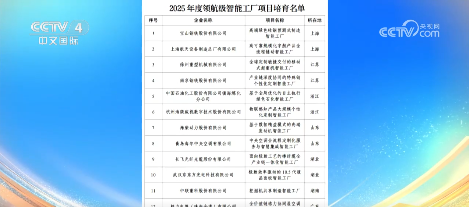 央视网消息:"智能"制造是制造业高质量发展的核心引擎。2025年年底,工业和信息化部等六部门联合公布了首批15家领航级智 能工厂名单,名单涵盖装备制造、原材料、电子信息等多个关键行业。首批领航级智能工厂不仅代表着当前中国制造"智能化"的最高 水平,更标志着中国智能制造从数字化、网络化迈向了智能化的关键跃升期。随着制造业数智转型迭代升级,赋能中国制造向全球价 值链高端稳步迈进。 | | | 2025年度领航级智能工厂项目培育名单 | | | | --- | --- | --- | --- | --- | | | 序号 | 企业名称 | 项目名称 | 所在地 | | CCTV 4 | 1 | 宝山钢铁股份有限公司 | 高端绿色硅钢预测式制造 智能工厂 | 上海 | | ■ヌ国际 | 2 | 上海航天设备制造总厂有限公司 | 高可靠规模化字航产品全 液程链动智能工厂 | 上海 | | | 3 | 徐州重型机械有限公司 | 全球定制敏捷交付的移动 式起重机智能工厂 | 江苏 | | | 4 | 南京钢铁股份有限公司 | 产业链深度协同的特殊钢 个性化定制智能工厂 | 江苏 | | | ને | 中国石油化工股份有限公 ...