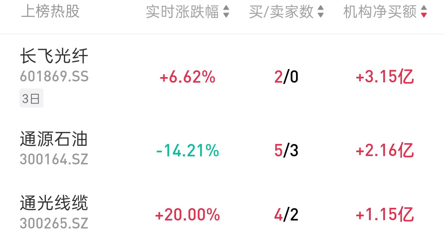 | 上榜热股 | 实时涨跌幅♀ 买/卖家数ុ | | | --- | --- | --- | | 长飞光纤 | | 2/0 | | 601869.SS | +6.62% | | | 3日 | | | | 通源石油 | -14.21% | 5/3 | | 300164.SZ | | | | 通光线缆 | | 4/2 | | AAA/F AF | +20.00% | | 长飞光纤 龙虎榜显示,今日2家机构净买入3.15亿。 公司是全球光纤光缆行业领军企业,唯一自主掌握PCVD、OVD、VAD三种主流光纤预制棒制备技术,并实现产业化。 龙虎榜知名游资 一、智能电网 龙虎榜机构热股 今天机构龙虎榜上榜40只个股,净买入20只,净卖出20只。当日机构买入最多的个股前三位是:长飞光纤(3.15亿)、通源石油(2.16亿)、通光线缆 (1.15亿)。 个股龙虎榜 公司已完成数据中心智能小母线及一体化电力模块研发,750V直流方案已在园区、楼宇、地铁落地,并储备800VHVDC技术,服务中国联通、佛山开普勒 等算力中心 据央视财经1月31日报道,当前全球AI算力建设进入爆发期,高功率、高稳定供电成为算力集群"生命线",电力设 ...