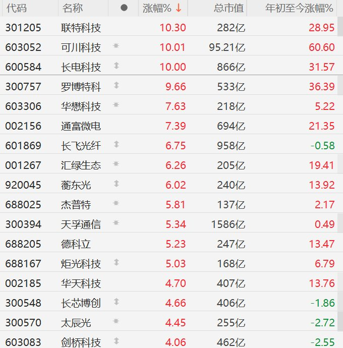 | 代码 | 名称 | | 涨幅% ↓ | 总市值 | 年初至今涨幅% | | --- | --- | --- | --- | --- | --- | | 301205 | 联特科技 | | 10.30 | 282亿 | 28.95 | | 603052 | 可川科技 | 策 | 10.01 | 95.21亿 | 60.60 | | 600584 | 长电科技 | 1 | 10.00 | 866亿 | 31.57 | | 300757 | 罗博特 | 1 | 9.66 | 533亿 | 36.39 | | 603306 | 华懋科技 | -澳 | 7.63 | 218亿 | 5.22 | | 002156 | 通富微电 | | 7.39 | 694亿 | 21.35 | | 601869 | 长飞光纤 | 1 | 6.75 | 958亿 | -0.58 | | 001267 | 汇绿生态 | -98- | 6.26 | 205亿 | 19.41 | | 920045 | 衡东光 | 1 | 6.02 | 240亿 | 13.92 | | 688025 | 杰譜特 | 兼 | 5.81 | 137亿 | 2.1 ...