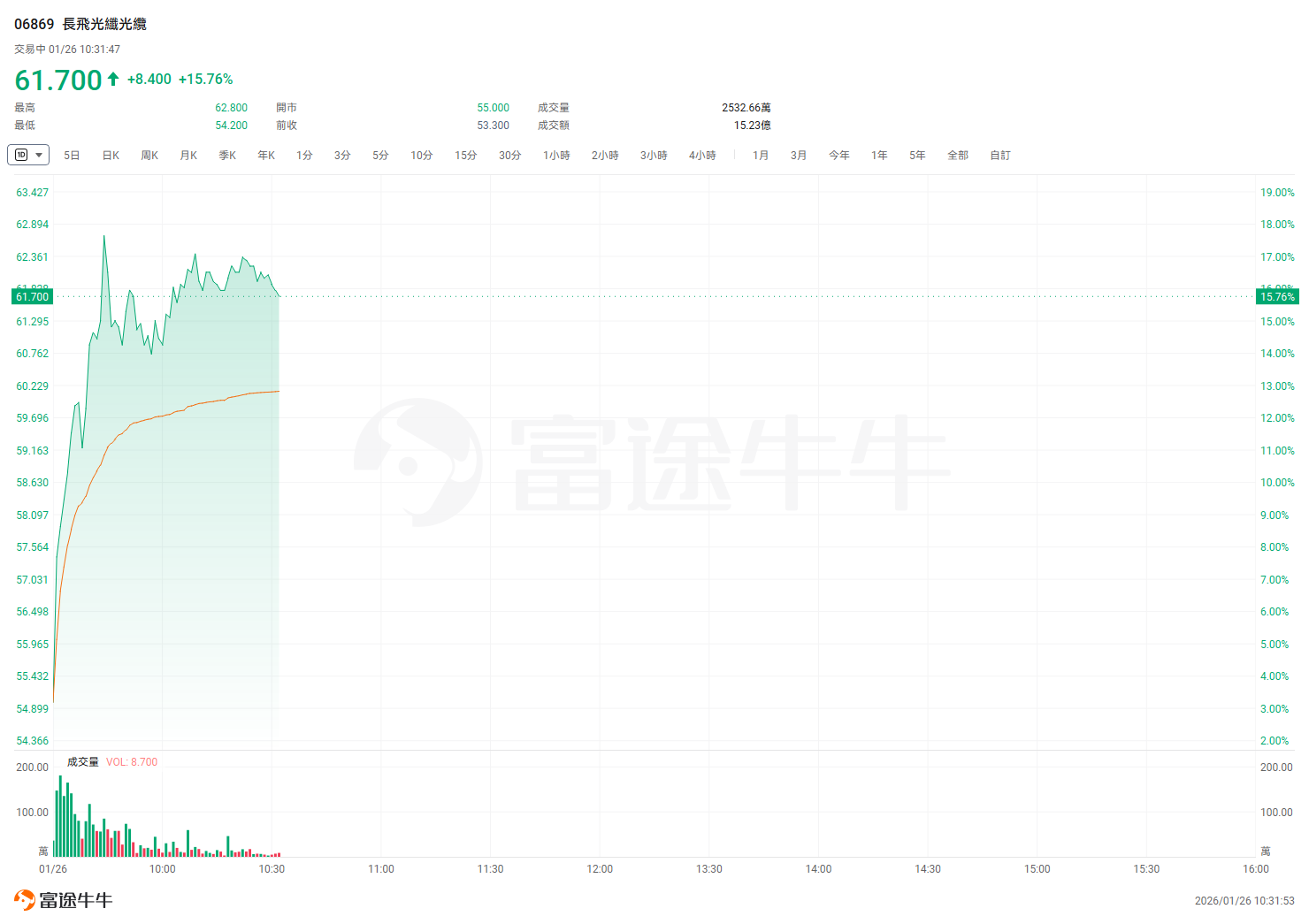 长飞光纤光缆(06869.HK)涨超16%