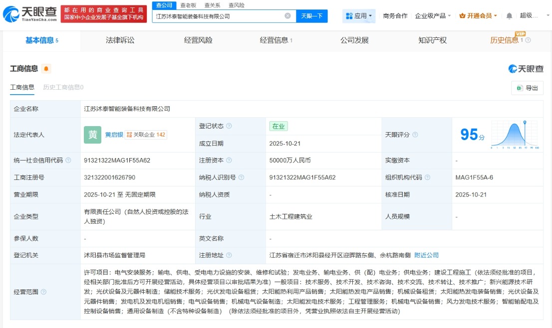 (文章来源:每日经济新闻) 每经AI快讯,天眼查App显示,近日,江苏沭泰智能装备科技有限公司成立,法定代表人为黄启银,注册资本5亿元人民币,经营范围包括新兴能源技术研 发、光伏设备及元器件制造、储能技术服务、光伏发电设备租赁等。股东信息显示,该公司由浙江正泰新能源开发有限公司全资持股。 | 都在用的商业查询工具 | 查公司 | 查表板 查关系 查风险 | | | | | | --- | --- | --- | --- | --- | --- | --- | | 国家中小企业发展了基金旗下机构 | | 江苏沐泰智能装备科技有限公司 | 天殿一下 一田园 品 | | 商务合作 企业级产品、 ★ 开通会员, | ● 超级 .. | | 基本信息 5 | 法律诉讼 | 经营风险 | 经营信息 1 公司发展 | 知识产权 | | | | 工商信息 ● | | | | | | 天眼音 | | 工商信息 历史工商信息0 | | | | | | al am | | 企业名称 | 江苏沐泰智能装备科技有限公司 | | | | | | | 法定代表人 | 启银 【 关联企业 142 | 登记状态 2 | 在业 | 天眼评分 2 ...