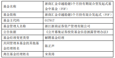 中国经济网北京2月9日讯 近日,浙江浙商证券资管公告,宋青涛离任浙商汇金卓越稳健3个月持有混合 发起式FOF、浙商汇金卓越配置一年持有混合FOF。 宋青涛先后任浙商证券研究所电子行业研究员、浙商证券自营业务股票和债券投资经理、基金经理。 浙商汇金卓越稳健3个月持有混合发起式(FOF)A/C成立于2023年07月31日,截至2026年02月05日,其今 年来收益率为1.17%、1.10%,成立来收益率为10.76%、8.10%,累计净值为1.1076元、1.0810元。 浙商汇金卓越配置一年持有混合(FOF)A/B成立于2021年11月08日,截至2026年02月05日,其今年来收 益率为1.45%、1.47%,成立来收益率为-21.34%、-20.63%,累计净值为2.3827元、2.1131元。 | 基金名称 | 浙商汇金卓越稳健3个月持有期混合型发起式基 | | --- | --- | | | 金中基金(FOF) | | 基金简称 | 浙商汇金卓越稳健3个月持有混合发起式(FOF) | | 基金主代码 | 017917 | | 基金管理人名称 | 浙江浙商证券资产管理有限公司 | | 公告依据 | 《公开 ...