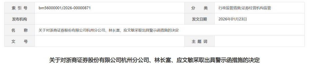1月23日,浙江证监局官网发布的行政监管措施公告显示,浙商证券杭州分公司被出具警示函。 | 索 引 号 | bm56000001/2026-00000871 | ਜੇ 崇 | 行政监管措施;证券经营机构监管 | | --- | --- | --- | --- | | 发布机构 | | 发文日期 | 2026年01月23日 | | 称 ਸਮ | 关于对浙商证券股份有限公司杭州分公司、林长富、应文敏采取出具警示函措施的决定 | | | | 文 号 | | 主题词 | | 二级市场上,截至23日收盘,浙商证券涨0.28%,报10.88元/股,总市值497.6亿元。 经查,浙商证券杭州分公司存在对投资者以往交易合规审核把关不严、账户实名制管理不到位的问题,违反了《证券经纪业务管理办法》(证监会令第 204号)第十一条第一款、第二十五条的规定。林长富、应文敏作为时任管理人员,对上述问题负有责任。 根据《证券经纪业务管理办法》(证监会令第204号)第四十三条的规定,浙江证监局决定对浙商证券杭州分公司、林长富、应文敏采取出具警示函的行 政监管措施,并记入证券期货市场诚信档案。 公开信息显示,近一年内,浙商证券及其子公司屡遭 ...
