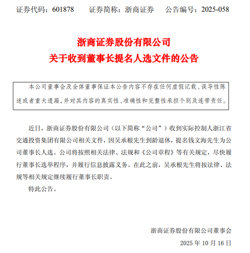 公告显示,浙商证券将按照相关法律、法规和《公司章程》等有关规定,尽快履行董事长选举程序,并 履行信息披露义务。在此之前,吴承根将按法律、法规等相关规定继续履行董事长职责。 登录新浪财经APP 搜索【信披】查看更多考评等级 点击查看公告原文>> 2025年10月16日,浙商证券发布公告称,公司收到实际控制人浙江省交通投资集团有限公司相关文件, 因现任董事长吴承根到龄退休,提名钱文海为公司董事长人选。 声明:市场有风险,投资需谨慎。 本文为AI大模型基于第三方数据库自动发布,任何在本文出现的信 息(包括但不限于个股、评论、预测、图表、指标、理论、任何形式的表述等)均只作为参考,不构成 个人投资建议。受限于第三方数据库质量等问题,我们无法对数据的真实性及完整性进行分辨或核验, 因此本文内容可能出现不准确、不完整、误导性的内容或信息,具体以公司公告为准。如有疑问,请联 系biz@staff.sina.com.cn。 责任编辑:小浪快报 此次董事长人选的变动,预计将对浙商证券的战略规划和运营管理产生一定影响,市场也将密切关注后 续选举程序的进展以及钱文海若当选后对公司发展带来的新变化。 ...