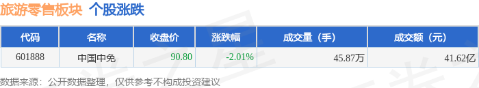 证券之星消息,1月27日旅游零售板块较上一交易日下跌2.01%,中国中免领跌。当日上证指数报收于 4139.9,上涨0.18%。深证成指报收于14329.91,上涨0.09%。旅游零售板块个股涨跌见下表: | 代码 | 名称 | 收盘价 | 涨跌幅 | 成交量(手) | | 成交额(元) | | | --- | --- | --- | --- | --- | --- | --- | --- | | 601888 | 中国中免 | 90.80 | -2.01% | | 45.87万 | | 41.62亿 | | 代码 名称 主力净流入(元) 主力净占比 游资净流入(元) 游资净占比 散户净占比 | | | | | | | | --- | --- | --- | --- | --- | --- | --- | | 601888 中国中免 | -3.71ZZ | -8.91% | 2.17亿 | 5.20% | 1.54亿 | 3.71% | | WHO == ' > TT == ( \ TT == L == ' = ( ) ( + < > + | | | | | | | 以上内容为证券之星据公开信息整理,由AI算 ...