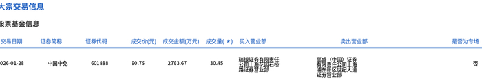 | be it it it is nother conside it book I had." | | | | | | | | | | --- | --- | --- | --- | --- | --- | --- | --- | --- | | 交易日期 | 证券简称 | 证券代码 | 成交价(元) 成交金额(万元) 成交量( *) 买入营业部 | | | | 卖出营业部 | 是否为专场 | | 026-01-28 | 中国中免 | 601888 | 90.75 30.45 | 2763.67 | 公司主要在國品業 | 觀點點 | | ко | 1月28日,中国中免大宗交易成交30.45万股,成交额2763.67万元,占当日总成交额的0.67%,成交价 90.75元,较市场收盘价89.84元溢价1.01%。 ...