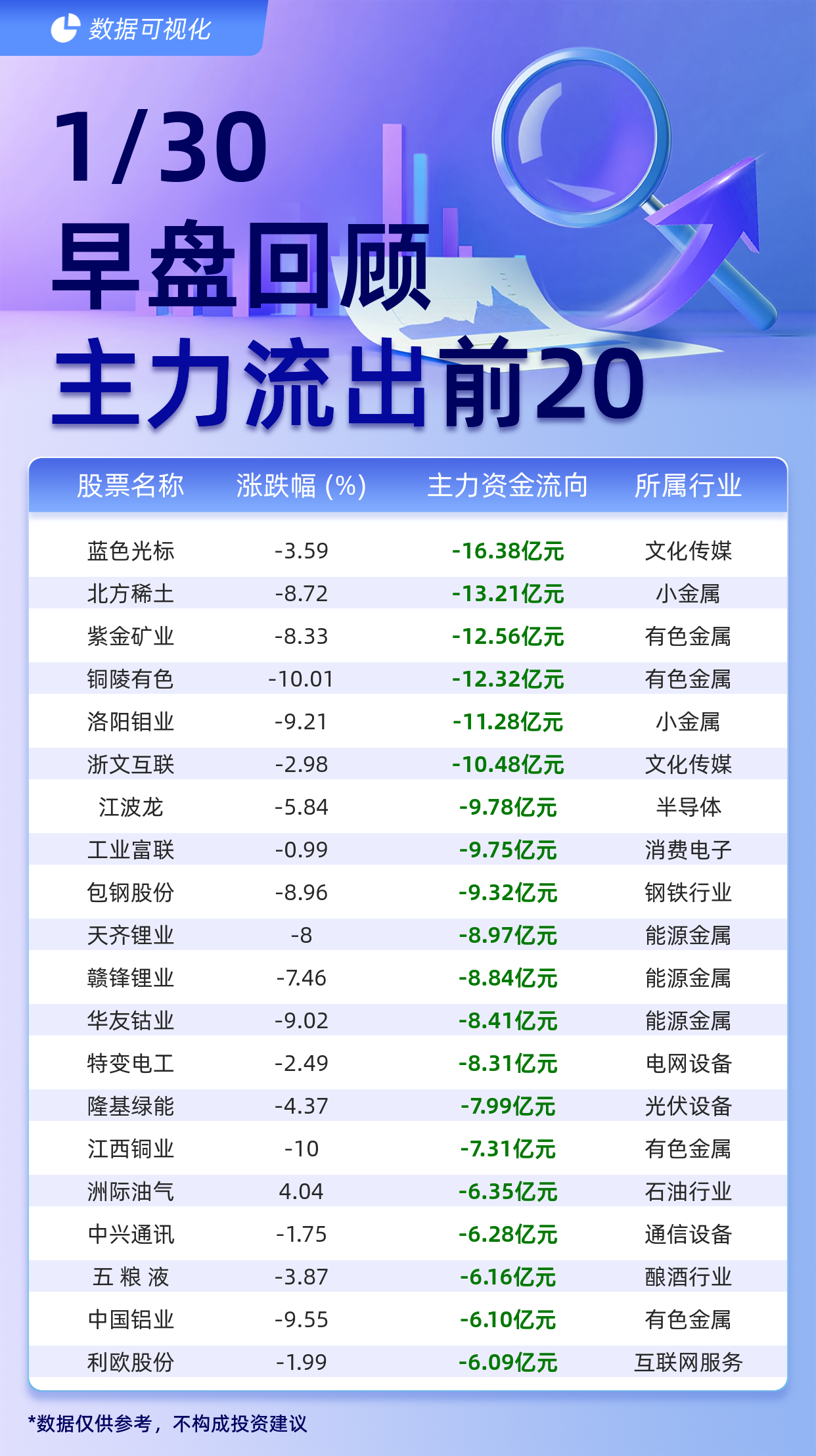 沪深京三市成交额28624亿元,较上日缩量3970亿元,三市超2400只个股飘红。 黄金、基本金属概念股现跌停潮,白酒、地产、券商、油气板块跌幅靠前,商业航天、金融科技、光 伏、AI应用题材调整。CPO、宇树机器人概念股活跃,农业股走强。 1月30日,A股市场呈现明显的板块分化特征。主力资金从前期热门的有色金属等周期板块大规模撤 离,转向通信、电子等科技成长板块。 | 土/ 欠立似状況叫 | | | | | --- | --- | --- | --- | | | | ·主力资金流入TOP5 | | | 代码 | 证券简称 | 涨跌幅(%) | 主力净流入额(亿元) | | 801770.SI | 通信(中万) | 344 | 157 20 | | 801080.SI | 电子(中万) | 0.68 | 101 83 | | 801890.SI | 机械设备(申万) | 0.21 | 55.17 | | 801010.SI | 农林牧渔(申万) | 0.65 | 41.83 | | 801030.SI | 基础化工(申万) | -0.31 | 37.64 | | | | ·主力资金流出TOP5 | | | 代码 ...