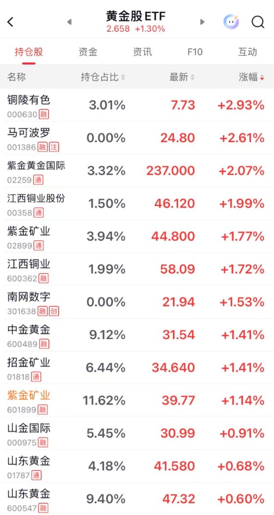 国投白银LOF大涨超9%。 2月25日,黄金、白银,再度拉升! (文章来源:每日经济新闻) | < | 黄金股ETF | | G Q | | --- | --- | --- | --- | | | 2.658 +1.30% | | | | 持仓股 | 资金 | 资讯 F10 | 互动 | | 名称 | 持仓占比 ÷ | 最新 = | 涨幅 ÷ | | 铜陵有色 | 3.01% | 7.73 | +2.93% | | 000630 融 | | | | | 马可波罗 | 0.00% | 24.80 | +2.61% | | 001386 融 注 | | | | | 紫金黄金国际 | 3.32% | 237.000 | +2.07% | | 02259 通 | | | | | 江西铜业股份 | 1.50% | 46.120 | +1.99% | | 00358 通 | | | | | 紫金矿业 | 3.94% | 44.800 | +1.77% | | 02899 通 | | | | | 江西铜业 | 1.99% | 58.09 | +1.72% | | 600362 融 | | | | | 南网数字 | 0.00 ...