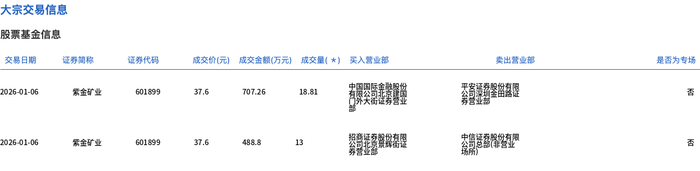 | 交易日期 | 证券简称 | 证券代码 | | | 成交价(元) 成交金额(万元) 成交量( *) 买入营业部 | | 类出营业部 | 是否为专场 | | | --- | --- | --- | --- | --- | --- | --- | --- | --- | --- | | 2026-01-06 | 属金矿业 | 668 TO9 | 37.6 | 707.26 | 18.81 | | 茶園茶園家園酒酒 | | 警 | | 2026-01-06 | 宝宝头不 | 601899 | 37.6 | 488.8 | 13 | 菜品店餐餐餐餐 | 去自意参得的女 | | Ka | 1月6日,紫金矿业大宗交易成交31.81万股,成交额1196.06万元,占当日总成交额的0.09%,成交价37.6 元,较市场收盘价37.6元持平。 ...