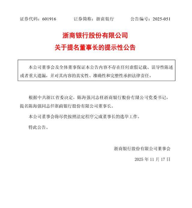 空缺4个月后,浙商银行迎来新任掌舵人! 11月17日晚间,浙商银行公告称,根据中共浙江省委决定,陈海强任该行党委书记,并提名任该行董事长。该 行董事会将尽快按照法定程序完成董事长的选举工作。 据了解,陈海强深耕金融业多年,2015年加入浙商银行,2020年获聘为该行副行长,今年4月出任该行党委副 书记,后兼任行长一职,直至此番履新。 据了解,陈海强现年51岁,曾先后就职于工商银行宁波北仑支行、中国投资银行宁波支行、国家开发银行浙江 省分行、招商银行宁波分行。 2015年初,陈海强加入浙商银行,历任该行宁波分行行长、杭州分行行长、总行行长助理兼杭州分行行长。 2020年3月,陈海强获聘为浙商银行副行长,次年又进入该行董事会,任执行董事。今年4月,他升任浙商银行 党委副书记,并获聘为行长,后于7月初获批任职资格,正式履职。 此番出任党委书记,并获提名为董事长后,他也将成为浙商银行2004年成立以来首位由内部提拔而来的掌舵 人。 业内人士认为,内部提拔有助于保持战略稳定,此次任职将在关键时期助力该行稳健发展、凝聚人心,推动该 行行稳致远、实现长期价值。 内部提拔 今年7月,浙商银行原董事长陆建强因到龄辞去在该行的全 ...