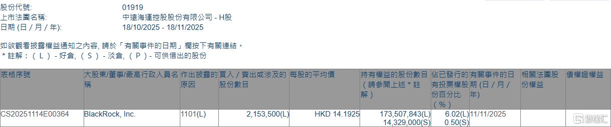 格隆汇11月18日丨根据联交所最新权益披露资料显示,2025年11月11日,中远海控(01919.HK)获BlackRock, Inc.在场内以每股均价14.1925港元增持好仓 215.35万股,涉资约3056.35万港元。 | 表格序號 | 大股東/董事/最高行政人員名 作出披露的買入 / 賣出或涉及的 每股的平均價 | | | | 持有權益的股份數目 佔已發行的有關事件的日 相關法國 | | | | --- | --- | --- | --- | --- | --- | --- | --- | | | | 只发 | 股份數目 | | (請参閱上犹*註 有投票權股期(日/月/ | | 份權益 | | | | | | | 出 份百分比 | | | | CS20251114E00364 | BlackRock, Inc. 2.153,500(L | 1101(L) | | HKD 14.1925 | 173.507.843(L) | 6.02(L)11/11/2025 | | | | | | | | 14,329,000(S) | 0.50(S) | | | 股份代號: | 01919 | | --- | - ...