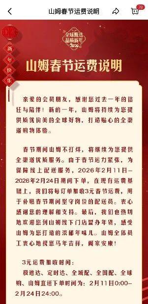 过年脚步临近, 春节假期是线上消费的高峰期, 也是运力较为紧张的时期。 山姆、盒马、叮咚买菜、永辉超市等 将在春节期间加收 每单3元至6元不等的服务费或运费。 山姆发布春节运费说明称,由于春节运力紧张,为保障线上配送服务,2026年2月11日至2月24日期间下单,山姆线上配送在现有运费基础上将每单加收3 元春节运费,用于补贴春节期间坚守岗位的配送员。 盒马发布通知称,春节期间(2026年2月14日0点至2月21日24点),全部用户(含X会员)通过盒马APP/盒马鲜生微信小程序/盒马支付宝小程序/淘宝小程 序/盒马作为商家入驻的其他平台下单购买[盒马鲜生/盒马mini】商品的线上配送订单,任意金额订单均按照6元/单收取基础运费;如订单商品超重,按日 常标准加收超重运费。前述期间结束后恢复日常运费标准。 生鲜零售平台集体通知, 叮咚买菜表示,因春节期间运力紧张,腊月廿八0点至正月初五24点(2026年2月15日0点至2026年2月21日24点),将与往年一致,每单额外收取3元春节服 务费。 永辉超市发布春节运费说明:2026年2月15日0点-2月21日24点期间,所有通过永辉线上超市APP、微信小程序及其他平台下 ...