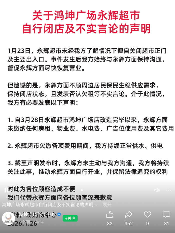 1月26日,就永辉北京一调改门店突然停业一事,北京鸿坤广场购物中心发布声明称,"1月23日,永辉 超市未经我方了解情况下擅自关闭超市正门及主要出入口。事件发生后我方始终与永辉方面保持沟通督 促永辉方面尽快恢复营业。"该购物中心表示,自永辉超市鸿坤广场店改造完毕以来,永辉方面未缴纳 任何房租、物业费、水电费、广告位使用费及其它费用。永辉超市欠缴各项费用期间,购物中心持续正 常供水、供电。 1. 自3月28日永辉超市鸿坤广场店改造完毕以来, 永辉方面 未缴纳任何房租、物业费、水电费、广告位使用费及其它费用 2. 永辉超市欠缴各项费用期间,我方持续正常供水、供电 3. 截至声明发布时,永辉方未主动与我方沟通,我方将持续 关注此事,推动永辉方面自行开业,并保留法律追究的权利 对此为各位顾客造成不便 。 我们代替永辉方面向各位顾客深表歉意 鸿坤广场永辉超市自行闭店及不实言论的声明... 展开 17 t田鸦坤宁场购物中心 � 6 +关注 26. 126 注 32 352 31 9 此前,智通财经走访发现,永辉超市北京鸿坤广场门店突然停业。一名现场工作人员告诉记者,停业的 主要原因是停水,但何时恢复营业他无法给出具体时间。 ...