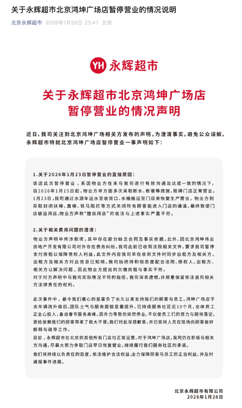 近日,永辉超市北京一调改门店突然停业一事引发关注。 1月26日深夜,北京永辉超市就鸿坤广场店暂停营业一事发布声明称,该店此次暂停营业,系因物业方在未与公司进行有效沟通及达成一致的情况下,自 2026年1月15日起,物业方单方面多次采取断水、断暖等措施,阻碍门店正常营业。1月23日,公司通过水源车运水至收货口、水桶搬运至门店来恢复生 产营业,物业方则采取封闭扶梯、直梯、铁马阻拦等方式关闭所有顾客能进入门店的通道,最终致使门店被迫闭店。物业方声称"擅自闭店"的说法与上 述事实严重不符。 就相关费用问题,永辉超市称,物业方声明中所涉款项,其中存在部分缺乏合同及事实依据。此外,因北京鸿坤伟业房地产开发有限公司对外存在债务 纠纷,公司此前已收到法院相关文件,要求公司暂停支付房租以保障债权人利益,此文件内容公司早在收到文件时同步出租方及相关方,出租方及相关 方对此信息已知晓。因此物业方提出的欠缴房租与事实不符。 永辉超市还表示,目前,永辉超市在北京的其他所有门店均正常运营。对于鸿坤广场店,公司仍在积极与相关方沟通,尽最大努力争取门店早日恢复营 业。 当日稍早时候,北京鸿坤广场购物中心发布声明表示,"1月23日,永辉超市未 ...