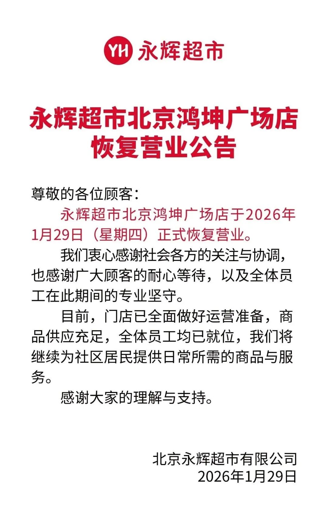 永辉超市(601933)工作人员:"之前是双方沟通有问题,现在已经解决了,总公司的公告已经发出来了"。 近日,#永辉一胖改门店暂停营业#冲上热搜。1月29日,北京商报小编向鸿坤广场核实得知,此前暂停营业的永辉超市已经恢复营业。 另外,永辉超市工作人员表示鸿坤广场店是长期开业:"已经开始正常营业了。之前是双方沟通有问题,现在已经解决了,总公司的公告已经发出来了"。 1月29日下午3时左右,北京商报小编从附近居民提供的照片中获悉,永辉超市仍在暂停营业状态。 下午5时左右,超市内商家表示,好多顾客都坐电梯下来了。该商家提供的图片显示,已有消费者在超市内选购商品。 与此同时,北京永辉超市发布公告称,永辉超市北京鸿坤广场店于2026年1月29日(星期四)正式恢复营业。公告显示,目前,门店已全面做好运营准 备,商品供应充足,全体员工均已就位。 图片来源:北京永辉超市微信公众号截图 就在几天前,永辉超市北京大兴一调改门店突然停业一事引发关注。1月26日深夜,北京永辉超市就鸿坤广场店暂停营业一事发布声明称,该店此次暂停 营业,系因物业方在未与公司进行有效沟通及达成一致的情况下,自2026年1月15日起,物业方单方面多次采取断 ...