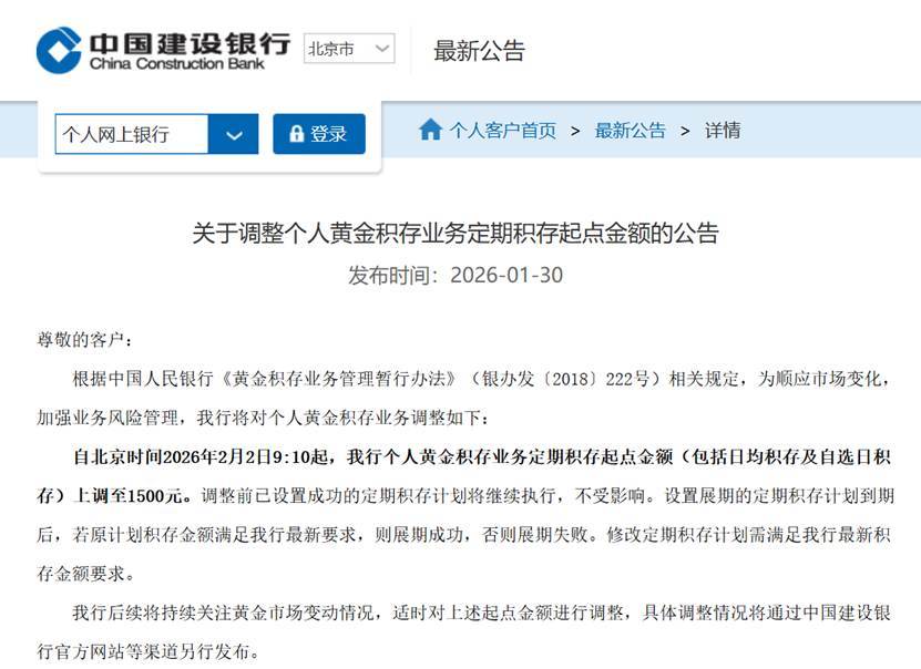 建设银行1月30日发布《关于调整个人黄金积存业务定期积存起点金额的公告》称,自北京时间2026年2 月2日9:10起,个人黄金积存业务定期积存起点金额(包括日均积存及自选日积存)上调至1500元。调整前 已设置成功的定期积存计划将继续执行,不受影响。设置展期的定期积存计划到期后,若原计划积存金 额满足我行最新要求,则展期成功,否则展期失败。修改定期积存计划需满足我行最新积存金额要求。 中国工商银行今日也发布公告,自2026年2月7日起,在周末以及法定节假日等非上海黄金交易所交易 日,我行将对如意金积存业务进行限额管理,限额类型包括全量或单一客户单日积存/赎回上限、单笔 积存或赎回总量上限等,并进行动态设置,提金不受影响。 关于调整如意全积存业务及部分品牌实物黄金产品销售业务办理 规则并修 订如意金积在业务协议的公告 尊敬的客户: 根据贵金属风险管理和业务需要,为提供更加优质高效的贵金属服务。依据《中国工商银行 加德金积存业务协议书《2025年版》》 第十五条有关我行可通 过公告方式揭晓如焦金明存的让秀办理提现并修改协议区本的的定,我行 将对加盟金相存业务以及部分品牌买物 黄金产品清售业务的办理规则进行调整,并 ...