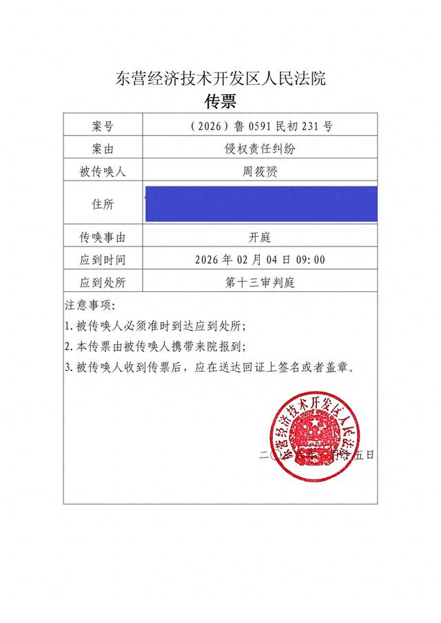 1月30日,当事律师周筱赟通过其微信公众号发布消息,他已正式起诉中国建设银行东营东城支行(以 下简称东营建行)。该案已经正式立案,东营经济开发区人民法院向其发放了正式的受理案件通知书, 案号为(2026)鲁0591民初231号。 根据东营开发区法院传票,开庭时间为2026年2月4日上午9时。 | (2026)鲁 0591 民初 231 号 | 案号 | | --- | --- | | 案由 | 侵权责任纠纷 | | 被传唤人 | 周筱贺 | | 住所 | | | 传唤事由 | 开庭 | | 应到时间 | 2026年02月04日09:00 | | 应到处所 | 第十三审判庭 | | 注意事项: | | | 1. 被传唤人必须准时到达应到处所; | | | 2. 本传票由被传唤人携带来院报到; | | | 3. 被传唤人收到传票后,应在送达回证上签名或者盖章。 | | 法院传票周筱赟提供 律师取4万元遭银行"盘问",反诈如何破解"误伤"难题? 周筱赟表示,建行总行的内部线人告知,这次不是由东营建行派员出庭,而是由北京的建行总行派出团 队。 回溯案件起因,去年11月3日,周筱赟在山东东营出差期间,前往中国建设银行东 ...