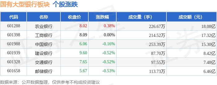 证券之星消息,12月2日国有大型银行板块较上一交易日上涨0.06%,农业银行领涨。当日上证指数报收 于3897.71,下跌0.42%。深证成指报收于13056.7,下跌0.68%。国有大型银行板块个股涨跌见下表: 从资金流向上来看,当日国有大型银行板块主力资金净流出4.49亿元,游资资金净流入1.22亿元,散户资 金净流入3.27亿元。国有大型银行板块个股资金流向见下表: | 代码 | 名称 | 收盘价 | 涨跌幅 | 成交量(手) | 成交额(元) | | | --- | --- | --- | --- | --- | --- | --- | | 601288 | 农业银行 | 8.02 | 0.38% | 226.67万 | | 18.08 Z | | 601398 | 工商银行 | 8.09 | 0.00% | 214.52万 | | 17.32 Z | | 601988 | 中国银行 | 6.06 | -0.16% | 253.39万 | | 15.30 Z | | 666109 | 建设银行 | 9.60 | -0.52% | 87.70万 | | 8.42 Z | | 601328 | 交通银行 ...