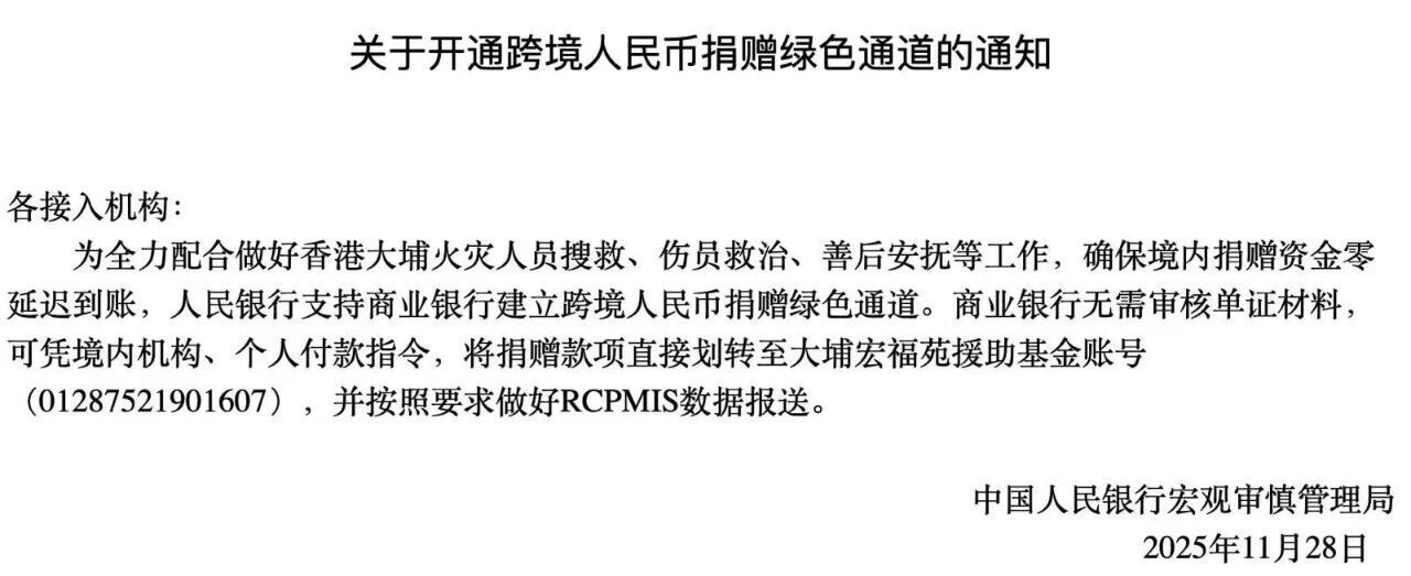 21世纪经济报道 唐婧 11月26日下午,香港新界大埔屋邨宏福苑多栋住宅楼发生火灾,造成重大人员伤亡。 一方有难,八方支援。截至发稿,工商银行(601398)、农业银行(601288)、中国银行(601988)、建设银行(601939)、交通银行(601328)、兴业银 行(601166)、浦发银行(600000)、民生银行(600016)等多家银行积极行动,通过捐款、提供应急金融服务等方式,全力支持救灾及灾后重建工作。 监管部门也在积极畅通捐赠渠道。11月28日,中国人民银行宏观审慎管理局发布通知,为全力配合做好香港大埔火灾人员搜救、伤员救治、善后安抚等工 作,确保境内捐赠资金零延迟到账,人民银行支持商业银行建立跨境人民币捐赠绿色通道。 通知显示,商业银行无需审核单证材料,可凭境内机构、个人付款指令,将捐赠款项直接划转至大埔宏福苑援助基金账号(01287521901607),并按照要求 做好RCPMIS数据报送。 农业银行:捐赠港币1000万元 同日,农业银行发文称,携同在港机构将向香港受灾地区捐赠港币1000万元,专项用于支持火灾救援及灾后重建工作,助力香港受灾同胞早日恢复正常生 活。灾情发生后,农业银行 ...