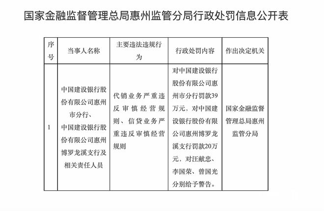 国家金融监管总局广东省分局近日披露两则行政处罚信息,惠州两家银行及相关责任人员被处罚,共计 罚款224万元。 因代销业务严重违反审慎经营规则、信贷业务严重违反审慎经营规则,国家金融监督管理总局惠州监管 分局对中国建设银行股份有限公司惠州市分行罚款39万元,对中国建设银行股份有限公司惠州博罗龙溪 支行罚款20万元,对该行工作人员汪献忠、李国荣、曾国光分别给予警告。 | 国家金融监督管理总局惠州监管分局行政处罚信息公开表 | | --- | | 序 | 当事人名称 | 主要违法违规行 | 行政处罚内容 | 作出决定机关 | | --- | --- | --- | --- | --- | | 号 | | 为 | 对中国建设银行 | | | | 中国建设银行股 份有限公司惠州 | 代销业务严重违 反审慎经营规 | 股份有限公司惠 州市分行罚款39 万元,对中国建 | 国家金融监督 | | | 市分行、 | 则、信贷业务严 | 设银行股份有限 | 管理总局惠州 | | | 中国建设银行股 | 重违反审慎经营 | 公司惠州博罗龙 | 监管分局 | | | 份有限公司惠州 | | | | | | 博罗龙溪支行及 | 规则 ...