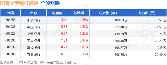 从资金流向上来看,当日国有大型银行板块主力资金净流入3.99亿元,游资资金净流出3.58亿元,散户资 金净流出4087.58万元。国有大型银行板块个股资金流向见下表: 证券之星消息,2月4日国有大型银行板块较上一交易日上涨0.73%,邮储银行领涨。当日上证指数报收 于4102.2,上涨0.85%。深证成指报收于14156.27,上涨0.21%。国有大型银行板块个股涨跌见下表: | 代码 | 名称 | 收盘价 | 涨跌幅 | 成交量(手) | 成交额(元) | | --- | --- | --- | --- | --- | --- | | 601658 | 邮储银行 | 5.11 | 1.59% | 188.83万 | 9.59 G | | 601988 | 中国银行 | 5.35 | 1.33% | 272.48万 | 14.55 Z | | 601328 | 交通银行 | 6.67 | 1.21% | 138.79万 | 9.23亿 | | 601398 | 工商银行 | 7.24 | 0.84% | 308.48万 | 22.29亿 | | 601939 | 建设银行 | 8.72 | 0.81% | 1 ...