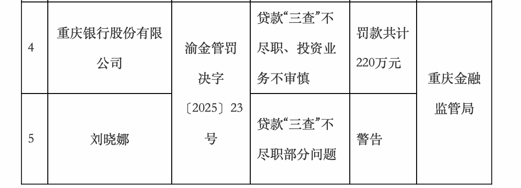 值得一提的是,今年下半年,重庆银行还迈入了"万亿俱乐部"。8月29日,重庆银行发布关于经营情况 的自愿性公告称,截至7月末,该行资产总额达到10087亿元,较上年末增加1521亿元,增幅为 17.76%。 10月22日,国家金融监督管理总局重庆监管局开具一批行政处罚公告,其中,重庆银行因涉及多项信贷 业务违规被罚款220万元。 公告显示,重庆银行存在的违法违规行为包括贷款"三查"不尽职、投资业务不审慎,因此对该行共计罚 款220万元。同时,该行相关负责人刘某娜因存在贷款"三查"不尽职部分问题,对其给予警告处罚。 | ব | 重庆银行股份有限 | | 贷款"三查" | 罚款共计 | | | --- | --- | --- | --- | --- | --- | | | 公司 | 渝金管罚 | 不尽职、投资 | 220万元 | | | | | 决字 | 业务不审慎 | | 重庆金融 | | ਦੇ | 刘晓娜 | (2025) | 贷款"三查" | | 监管局 | | | | 23号 | 不尽职部分问 | 警告 | | | | | | 题 | | | 【导读】因贷款"三查"不尽职等问题,重庆银行被罚220万元 公开 ...