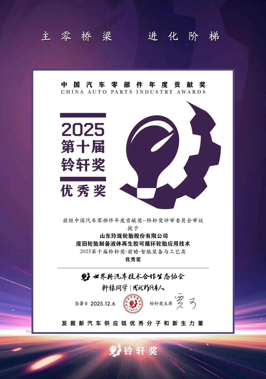 "废旧轮胎制备液体再生胶可循环轮胎应用技术",在温和可控的低温环境下,通过连续化、自动化的精密系统,将废旧轮胎高效转化为性能优异的液态再 生胶。生产过程能耗显著降低,避免了高温裂解二次污染,实现清洁化连续生产。所得液体再生胶分子量分布均匀、相容性与流动性俱佳,大幅提升资源 附加值,推动了从"废弃"到"高值利用"的循环。 该技术不仅破解了废旧轮胎的"黑色污染"治理难题,更将之转化为可持续的绿色资源,有效减少原材料开采与整体碳排放,为轮胎行业提供了经济与环境 效益并重的解决方案,引领产业循环经济迈向高端化、低碳化新阶段。 近日,第十届铃轩奖颁奖典礼在苏州揭晓。在为期半年、经过29位专家严格评审的激烈角逐中,玲珑轮胎(601966)从百余项申报中脱颖而出,斩获双项 大奖:"废旧轮胎制备液体再生胶可循环轮胎应用技术"荣膺前瞻类优秀奖,"新玲珑大师致途"夺得量产类优秀奖。玲珑第六次成为该汽车零部件权威奖项 唯一获奖的轮胎企业,彰显了其持续领先的创新能力。 当前,全球汽车产业正经历深刻变革,中国在新能源与智能网联汽车领域已走在世界前列。玲珑紧跟产业趋势,以前瞻技术与高端产品双轮驱动,为汽车 产业提供面向未来的解决方案。 ...