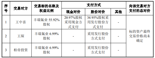 中国经济网北京2月10日讯海南矿业(601969)(601969.SH)今日复牌,开盘涨停报13.87元,涨幅9.99%, 随后股价跳水转跌。截至午间收盘,该股报12.33元,下跌2.22%,振幅14.04%,成交额11.36亿元,换手率 4.48%,总市值246.38亿元。 标的公司位于河南省栾川县,专注于萤石矿的开发和运营,以及萤石产品的生产和销售。主要产品包括酸 级萤石精粉、高品位萤石块矿和无水氟化氢。 2023年度、2024年度、2025年1-9月,丰瑞氟业营业收入分别为60,898.53万元、66,813.52万元、49,482.79万 元,净利润分别为11,438.14万元、13,611.43万元、13,038.22万元。 停牌前最后一个交易日即1月28日,海南矿业收涨7.59%。 海南矿业昨晚披露的发行股份及支付现金购买资产并募集配套资金暨关联交易预案显示,上市公司拟通过 发行股份及支付现金的方式向王中喜、王琛和柏帝投资共3名交易对方购买其合计持有的洛阳丰瑞氟业有 限公司(以下简称"丰瑞氟业")69.90%股权。本次交易完成后,丰瑞氟业将成为上市公司控股子公司。 | 序号 | 交易对方 | 交易 ...