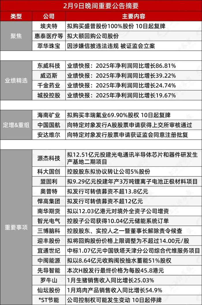 上市公司拟通过发行股份及支付现金的方式向至骞实业、刘燕、嘉兴蔓月、上海郗舜、李强、李天智、 洋浦昆宁、新余鸿土、上海捌芯、王晨共10名交易对方购买其持有的盛普股份95.97%股份;同时,上 市公司拟通过支付现金的方式向上海翌耀、共青城凯翌购买其持有的盛普股份4.03%股份。本次交易预 计构成重大资产重组。 公司表示:本次交易完成后,上市公司与标的公司将进行深度融合和协同,本次重组将提升上市公司的 业务规模、提高上市公司的持续发展能力、改善上市公司盈利能力、增强全体股东回报,符合上市公司 和全体股东的利益。 | | | 2月9日晚间重要公告摘要 | | --- | --- | --- | | 楽曲 | 公司 | 主要内容 | | 聚焦 | 埃夫特 | 拟购买盛普股份100%股份 10日起复牌 | | | 惠泰医疗等 | 拟大额回购公司股份 | | | 萃华珠宝 | 因涉嫌信披违法违规 被证监会立案 | | | 东威科技 | 业绩快报:2025年净利润同比增长86.81% | | | 威迈斯 | 业绩快报:2025年净利润同比增长39.22% | | 业绩精选 | 千金药业 | 业绩快报:2025年净利润同比增长 ...