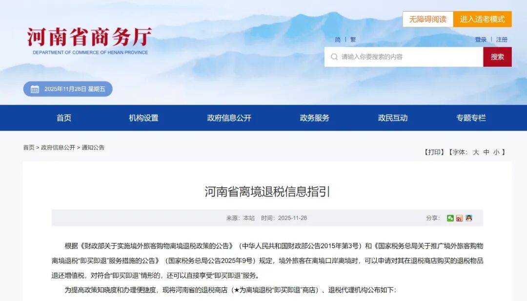 将"入境流量"转化为"消费增量",不断优化的离境退税举措持续激活着境外旅客来华的消费意愿。11月28日,省商务厅印发《河南省离境退税信息指引》 (以下简称《指引》),公布河南省退税商店和退税代理机构。 我省离境退税商店都在哪里?《指引》显示,我省离境退税商店共有郑州丹尼斯百货有限公司 (大卫城店)、许昌市胖东来商贸集团有限公司等41家, 分别在郑州市、洛阳市、开封市、焦作市、新乡市、许昌市、安阳市等地。境外旅客在离境口岸离境时,可以申请对其在退税商店购买的退税物品退还增 值税,对符合"即买即退"情形的,还可以直接享受"即买即退"服务。 其中,我省选定郑州丹尼斯大卫城、正弘城作为第一批"即买即退"试点退税商店。据了解,境外旅客在"即买即退"商店购买退税物品,办理信用卡预授权 后,即可在现场领取等额退税款;旅客离境时,海关核验旅客身份和退税物品;退税代理机构审核购物退税信息无误后,当即解除信用卡预授权担保,并 办结离境退税事项。 1. 离境退税商店 网点地址(精准到门牌号、商户号) 商店(网点)名称 序号 所在地区 郑州丹尼斯百货有限公司 郑州市北二七路西、太康路北 郑州 l (大卫城店)★ 河南正弘商业管理有限 ...
