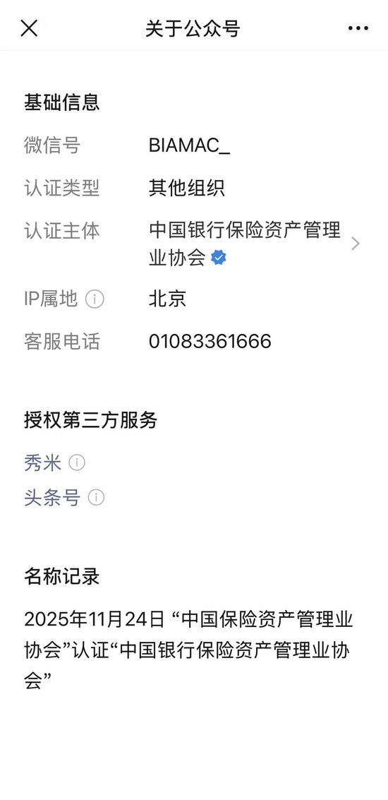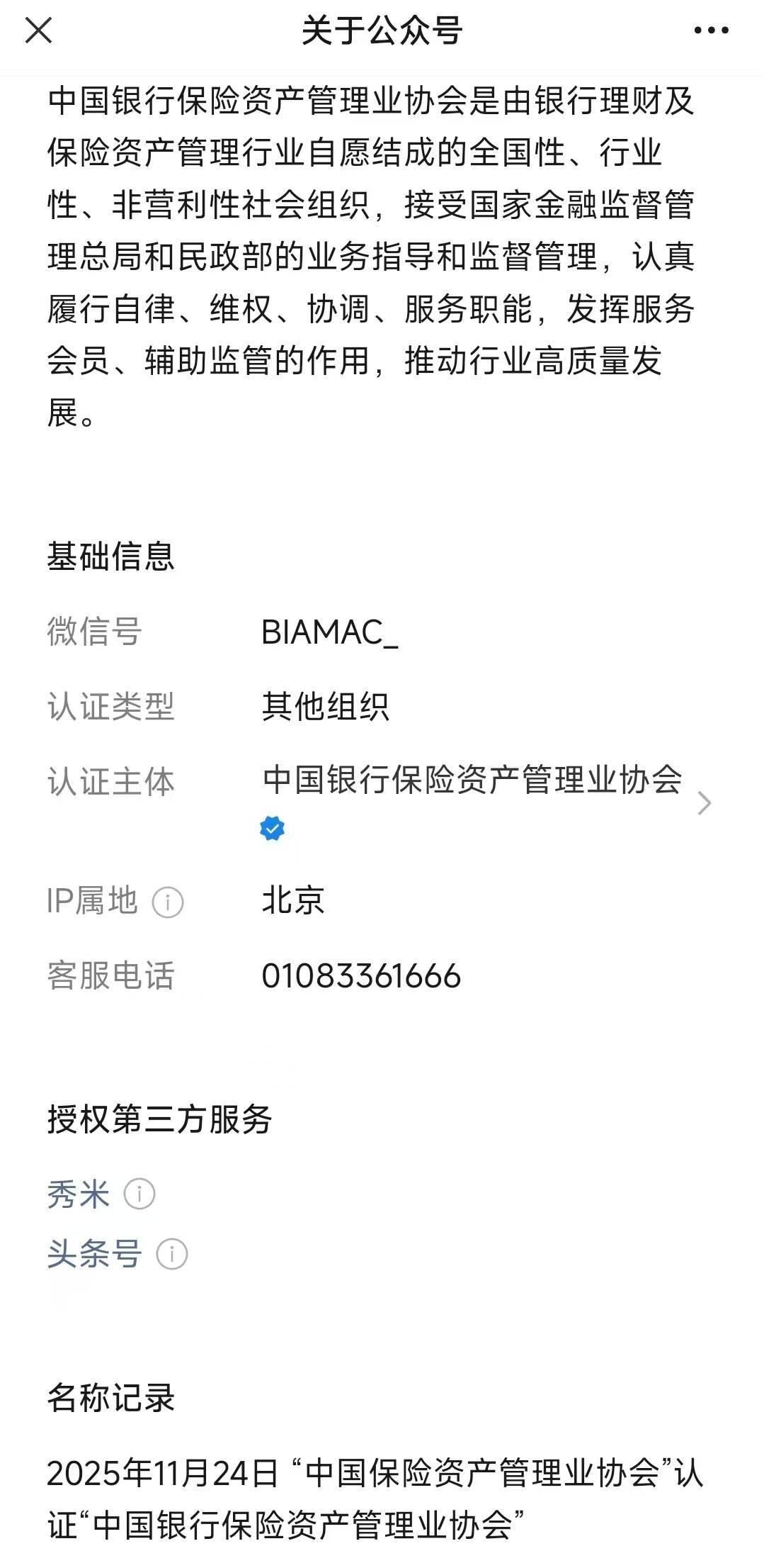 简介显示,中国银行保险资产管理业协会是由银行理财及保险资产管理行业自愿结成的全国性、行业 性、非营利性社会组织。 北京商报讯(记者 李秀梅)11月24日,北京商报记者注意到,中国保险资产管理业协会微信公众号已 经更名为中国银行保险资产管理业协会。 此前有消息称,该协会将更名为"中国银行保险资产管理业协会",成为覆盖整个银行保险资管业的行业 自律组织。 ...