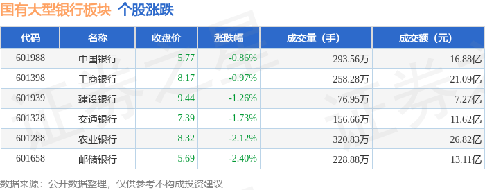 证券之星消息,11月17日国有大型银行板块较上一交易日下跌1.51%,邮储银行领跌。当日上证指数报 收于3972.03,下跌0.46%。深证成指报收于13202.0,下跌0.11%。国有大型银行板块个股涨跌见下表: | 代码 | 名称 | 收盘价 | 涨跌幅 | 成交量(手) | 成交额(元) | | | --- | --- | --- | --- | --- | --- | --- | | 601988 | 中国银行 | 5.77 | -0.86% | 293.56万 | | 16.88 Z | | 601398 | 工商银行 | 8.17 | -0.97% | 258.28万 | | 21.09亿 | | 656109 | 建设银行 | 9.44 | -1.26% | 76.95万 | | 7.27亿 | | 601328 | 交通银行 | 7.39 | -1.73% | 156.66万 | | 11.62亿 | | 601288 | 农业银行 | 8.32 | -2.12% | 320.83万 | | 26.82亿 | | 601658 | 邮储银行 | 5.69 | -2.40% | 228.88万 ...