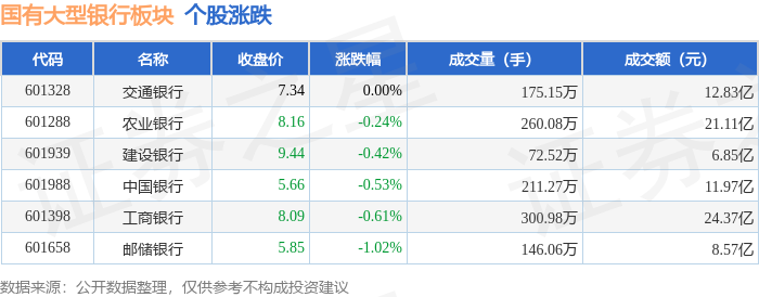 证券之星消息,11月6日国有大型银行板块较上一交易日下跌0.46%,邮储银行领跌。当日上证指数报收 于4007.76,上涨0.97%。深证成指报收于13452.42,上涨1.73%。国有大型银行板块个股涨跌见下表: | 代码 | 名称 | 收盘价 | 涨跌幅 | 成交量(手) | 成交额(元) | | --- | --- | --- | --- | --- | --- | | 601328 | 交通银行 | 7.34 | 0.00% | 175.15万 | 12.83 Z | | 601288 | 农业银行 | 8.16 | -0.24% | 260.08万 | 21.11亿 | | 656109 | 建设银行 | 9.44 | -0.42% | 72.52万 | 6.85 Z | | 601988 | 中国银行 | 5.66 | -0.53% | 211.27万 | 11.97亿 | | 601398 | 工商银行 | 8.09 | -0.61% | 300.98万 | 24.371Z | | 601658 | 邮储银行 | 5.85 | -1.02% | 146.06万 | 8.571Z | 以上内容为证 ...