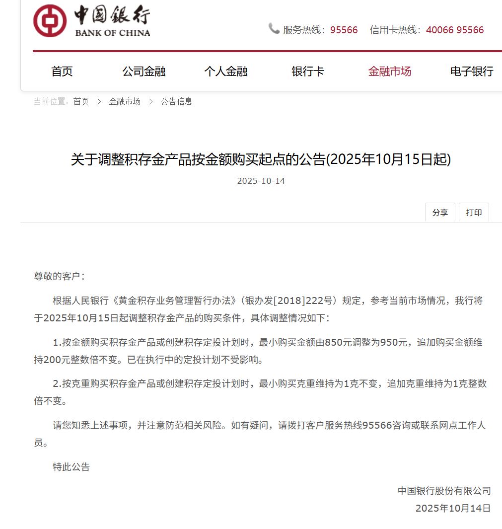 10月15日起!中国银行积存金产品按金额购买起点调整为950元