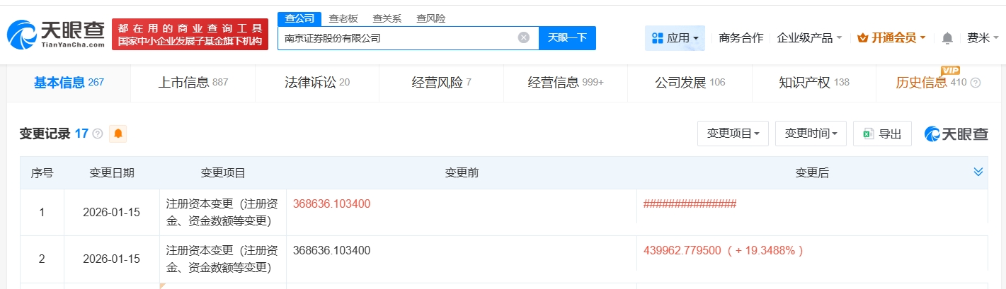 | | | 都在用的 商业 查 询 工 具 | 草公司 首老板 | 商关系 音风险 | | | | | --- | --- | --- | --- | --- | --- | --- | --- | | | | 家中小企业发展子基金旗下机构 | 南京证券股份有限公司 | | × 天眼一下 | ª 应用 ▼ 商务合作 | | | 基本信息 267 | | 上市信息 887 | 法律诉讼 20 | 经营风险 7 | 经营信息 999+ | 公司发展 106 | | | 变更记录 17 2 ● | | | | | | 变更项目, | | | 序号 | 变更日期 | 变更项目 | | 变更前 | | | | | 1 | 2026-01-15 | 注册资本变更(注册资 金、资金数额等变更) | 368636.103400 | | | ## | | | 2 | 2026-01-15 | 注册资本变更(注册资 | 368636.103400 | | | 439962.779500 ( + 19.34{ | | | | | 金、资金数额等变更) | | | | | | | | 都在用的商业查询工具 | | 夏公司 直老板 | ...