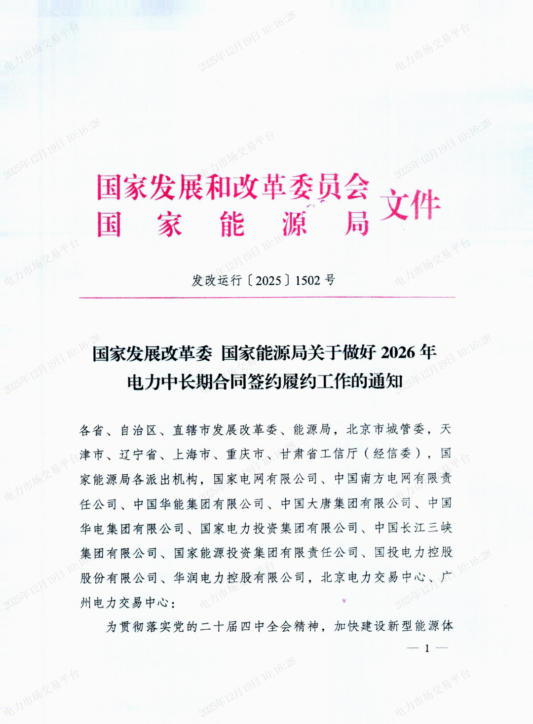 《通知》要点如下: ·燃煤发电等支撑性电源电力中长期合同签约比例 各地省内市场燃煤发电企业年度电力中长期合同总签约电量应不低于上一年实际上网电量的70%,并通过后续合同签订,保障每月月度及以上电力中长期 合同签约电量比例不低于预计市场化上网电量的80%。 ·用电侧签约比例 保障用电侧每月月度及以上电力中长期合同签约电量比例不低于预计用电量的80%。 (来源:江苏省可再生能源行业协会) 12月17日,国家发展和改革委、国家能源局联合发布《关于做好2026年电力中长期合同签约履约工作的通知》,将通过做好2026年电力中长期合同高比例 签约工作,提高提高电力中长期合同签约质量,保障电力中长期合同高效履约,完善电力中长期合同保障机制等四大关键举措,推动电力中长期合同签约 履约工作落地见效。 ·跨省跨区签约 各地要明确跨省跨区输电工程配套新能源。鼓励通过绿色电力交易形式落实跨省跨区优先发电规模计划。建立并完善大基地内部各电源整体参与电力市场 交易模式。 ·完善分时段、带曲线签约机制 各地应在年度电力中长期交易组织中实现电力中长期分时段交易。 电力现货市场正式运行和长周期试运行地区:做好中长期市场与现货市场的有效衔接,交 ...