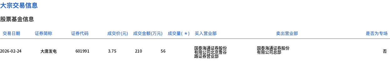 2月24日,大唐发电大宗交易成交56万股,成交额210万元,占当日总成交额的0.38%,成交价3.75元,较市场收盘价3.75元持平。 | | | | | | | | 国泰海通证券股份 有限公司总部 | | --- | --- | --- | --- | --- | --- | --- | --- | | 交易日期 2026-02-24 | 证券简称 大唐发电 | 证券代码 601991 | 成交价(元) 成交金额(万元) 成交量( * ) 买入营业部 3.75 | 210 | 56 | 国泰海通证券股公 有限公司北京警公 | 卖出营业部 | ...