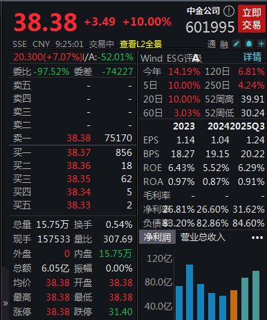 中金公司、东兴证券、信达证券今日复牌,中金公司A股开盘涨停,H股涨逾7%。东兴证券涨停,信达 证券高开6.8%。 | 38 38 +3.49 +10.00% | | | 中金公司 (1) 立即 601995 交易 | | --- | --- | --- | --- | | SSE CNY 9:25:01 交易中 查看L2全景 | | | 通融/ ● 十 | | 20.300(+7.07%)I/A :- 52.01% Wind ESG评级 | | | 详情 | | 委比-97.52% 委差 -74227 | | | 今年 14.19% 120日 6.81% | | 图 | - | IC | 5日 10.00% 250日 4.24% | | 卖口 | 1 | 12 | 20日 10.00% 52周高 39.91 | | 25 60日 | | - | 3.03% 52周低 30.24 | | 三三 | 1 | - | 2023 20242025Q3 | | EPS | 38.38 | 75170 | 1.14 1.04 1.24 | | BPS | 38.37 | 856 | 18.27 19.15 20.22 | ...