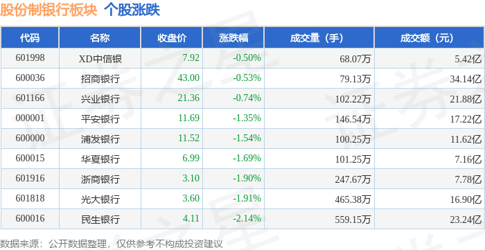 从资金流向上来看,当日股份制银行板块主力资金净流出5.23亿元,游资资金净流入2.24亿元,散户资金 净流入2.99亿元。股份制银行板块个股资金流向见下表: 证券之星消息,11月21日股份制银行板块较上一交易日下跌1.29%,民生银行领跌。当日上证指数报收于 3834.89,下跌2.45%。深证成指报收于12538.07,下跌3.41%。股份制银行板块个股涨跌见下表: | 代码 | 名称 | 收盘价 | 涨跌幅 | 成交量(手) | 成交额(元) | | --- | --- | --- | --- | --- | --- | | 601998 | XD中信银 | 7.92 | -0.50% | 68.07万 | 5.42亿 | | 600036 | 招商银行。 | 43.00 | -0.53% | 79.13万 | 34.14 Z | | 601166 | 兴业银行 | 21.36 | -0.74% | 102.22万 | 21.88亿 | | 000001 | 平安银行 | 11.69 | -1.35% | 146.54万 | 17.22亿 | | 600000 | 浦发银行 | 11.52 | -1.54 ...