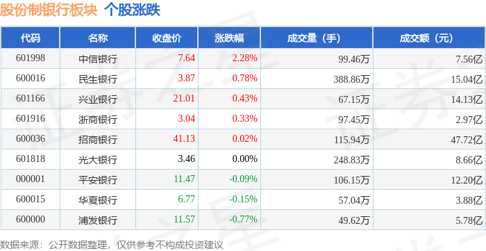 证券之星消息,1月13日股份制银行板块较上一交易日上涨0.26%,中信银行领涨。当日上证指数报收于 4138.76,下跌0.64%。深证成指报收于14169.4,下跌1.37%。股份制银行板块个股涨跌见下表: | 代码 | 名称 | 主力净流入(元) | 主力净占比 游资净流入(元) | | 游资净占比 散户净流入 (元) | | 散户净占比 | | --- | --- | --- | --- | --- | --- | --- | --- | | 000001 | 平安银行 | 1.39 Z ﮯ | 11.43% | -2919.19万 | -2.39% | -1.10 Z | -9.03% | | 600016 民生银行 | | 1.12 Z | 7.43% | -4353.64万 | -2.89% | -6822.42万 | -4.54% | | 601166 兴业银行 | | 9577.58万 | 6.78% | -8953.85万 | -6.33% | -623.73万 | -0.44% | | 601998 中信银行 | | 3989.14万 | 5.28% | -3851.13万 | -5.10 ...