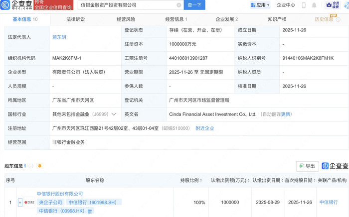 | | 股东名称 | 持股比例 : | 认缴出资额(万元) ۾ 认缴出资日期 ۾ 首次持股日期 ۾ 关联产品/机构 | | --- | --- | --- | --- | | | 中信银行股份有限公司 | | | | 1 | + @*** 央企子公司 中信银行 (601998.SH) | 100% | 1000000 2025-08-29 2025-11-26 中信银行 | | | 中信银行(00998.HK) 町 | | | 企查查APP显示,近日,信银金融资产投资有限公司成立,法定代表人为蒋东明,注册资本100亿人民 币,经营范围为非银行金融业务。企查查股权穿透显示,该公司由中信银行(601998)全资持股。 | C) 企查查 传奇 全国企业信用意询 | 信银金融资产投资有限公司 | | ○ 童一下 | ■应用 · 企业中心 | 0 | 0 电子 | 8 | | --- | --- | --- | --- | --- | --- | --- | --- | | 基本信息 10 | 法律诉讼 | 经营风险 | 经营信息 1 企业发展 2 | | 知识产权 | 历史信息 ◎ | | | 法定代表人 | 弱东明 ...