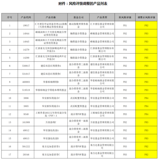 受市场行情变化影响,多家银行调整代销基金风险等级。 10月9日,中信银行官网发布一则公告称,自2025年10月15日起,该行将陆续调整部分代销 资产管理产品的风险评级,共计17只。值得注意的是,此为该行年内第四次调整代销基金产 品风险评级,其中15只上调、2只下调。该行表示,此次调整是根据监管要求,为做好投资 者适当性管理安排,切实履行适当性义务,保护投资者权益,该行遵循同类产品风险评级一 致性、产品风险评级随市场和政策动态调整等主要原则进行的调整。 事实上,除了中信银行,年内亦有农业银行、建设银行、民生银行、宁波银行等多家银行对 旗下代销公募基金产品风险评级进行调整。从公开资料看,绝大多数基金的风险评级均为向 上调整。 又有银行上调基金风险评级, 仅2只产品下调 近日,中信银行发布公告,宣布自10月15日起陆续对17只代销资产管理产品的风险评级进行 调整,其中15只上调、2只下调,涉及汇添富基金、建信基金、华泰柏瑞基金、华安基金、 易方达基金等多家机构。 | 序号 | 产品代码 | 产品名称 | 基金公司 | 产品类型 | 原风险评级 | 调整后风险评级 | | --- | --- | --- | --- ...