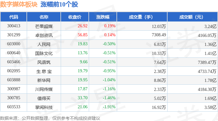 证券之星消息,11月12日数字媒体板块较上一交易日下跌0.86%,*ST返利领跌。当日上证指数报收于 4000.14,下跌0.07%。深证成指报收于13240.62,下跌0.36%。数字媒体板块个股涨跌见下表: | 代码 | 名称 | 收盘价 | 涨跌幅 | 成交量(手) | 成交额(元) | | | --- | --- | --- | --- | --- | --- | --- | | 300413 | 芒果超媒 | 26.92 | 0.19% | 12.03万 | | 3.24亿 | | 301299 | 卓创资讯 | 56.85 | 0.14% | 7308.49 | | 4166.05万 | | 603000 | 人民网 | 19.83 | -0.50% | 6.83万 | | 1.36亿 | | 600640 | 国脉文化 | 13.76 | -0.51% | - 10.33万 | | 1.41亿 | | 603466 | 风語筑 | 9.66 | -0.51% | 7.64万 | | 7389.47万 | | 002095 | 生意宝 | 19.79 | -0.95% | 2.38万 | | 47 ...