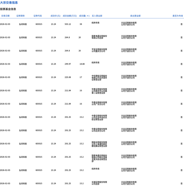 | 交易日期 | 证券简称 | 证券代码 | | | 成交价(元) 成交金额(万元) 成交量(*) 买入营业部 | | 类出营业部 | 是否为专场 | | --- | --- | --- | --- | --- | --- | --- | --- | --- | | 2026-02-03 | 弘讯科技 | 603015 | 13.24 | 503.12 | 38 | 机构专用 | 一是一般的量 | 移 | | 2026-02-03 | 弘讯科技 | 510809 | 13.24 | 264.8 | 20 | 一次 后公司 | 关于原因的角度 | 图 | | 2026-02-03 | 弘讯科技 | 603015 | 13.24 | 264.8 | 20 | 公司 12 13 | 公司主要参议员 | 물 | | 2026-02-03 | 弘讯科技 | 603015 | 13.24 | 249.97 | 18.88 | 机构专用 | 一点击数据 | KA | | 2026-02-03 | 弘讯科技 | STOEO9 | 13.24 | 225.08 | 17 | | 三年级家庭用 | KO | | 2026-02- ...