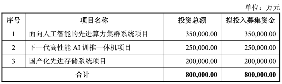 募资 80 亿:算力集群 35 亿、训推一体机 25 亿、存储 20 亿