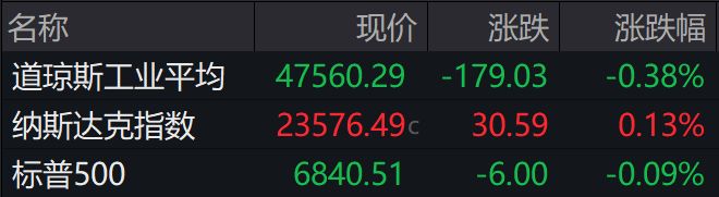 【财经日历】 中国11月CPI、PPI 2025中国铂族金属市场年会(三亚) | 名称 | 现价 | 涨跌 | 涨跌幅 | | --- | --- | --- | --- | | 道琼斯工业平均 | 47560.29 -179.03 | | -0.38% | | 纳斯达克指数 | 23576.49c | 30.59 | 0.13% | | 标普500 | 6840.51 | -6.00 | -0.09% | 加拿大央行公布利率决议 EIA公布月度短期能源展望报告 当地时间周二,美股三大指数涨跌互现,截至收盘,标普500指数微跌0.09%,纳指涨0.13%,道指跌 0.38%。 小盘股在利率预期推动下保持韧性,罗素2000指数盘中再创历史新高,最终收涨0.21%报2526.24点。 大型科技股走势分化。微软上涨0.20%,亚马逊上涨0.45%,谷歌A上涨1.07%,特斯拉涨1.29%;苹果 下跌0.26%,英伟达下跌0.31%,Meta走弱1.48%。 纳斯达克中国金龙指数收跌1.37%。热门中概股多数回落,百度跌超4%,小鹏、理想、贝壳跌逾3%。 大宗商品方面,国际油价下跌,纽约商品交易所2026年1月交货的 ...