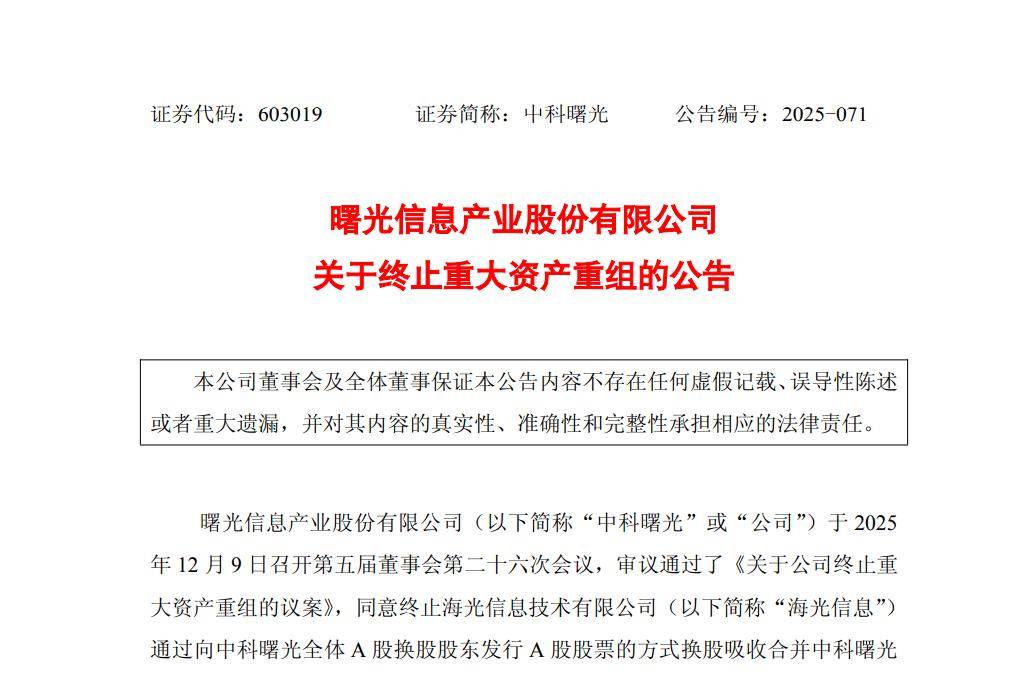 国产算力领域两大巨头的合并搁浅。 12月9日晚间,海光信息、中科曙光(603019)同步发布公告,宣布终止此前筹划的重大资产重组事项。 对于终止原因,海光信息、中科曙光在公告中表示,由于本次交易规模较大、涉及相关方较多,使得重大资产重组方案论 证历时较长,且当前市场环境较筹划之初发生较大变化,本次实施重大资产重组的条件尚不成熟。为维护上市公司和广大 投资者长期利益,经与交易各方友好协商、充分论证后,决定终止本次交易。 12月10日,海光信息召开终止重大资产重组投资者说明会,回应投资者关切。 突发公告:终止重组 海光信息换股吸收合并中科曙光的计划搁浅。 同时,中科曙光也公告称,公司于2025年12月9日召开董事会,审议通过了《关于公司终止重大资产重组的议案》,同意终 止海光信息通过向中科曙光全体A股换股股东发行A股股票的方式换股吸收合并中科曙光并募集配套资金,并授权公司管理 层办理本次终止的相关事宜。 12月9日晚间,海光信息公告称,公司于2025年12月9日召开董事会,审议通过议案,同意公司终止通过向中科曙光全体A 股换股股东发行A股股票的方式换股吸收合并中科曙光并募集配套资金,并授权公司管理层办理本次终止相 ...