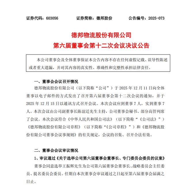 中经记者 杨让晨 张家振 上海报道 12月16日,德邦物流(603056.SH)发布第六届董事会第十二次会议决议公告称,同意选举王振辉为公 司第六届董事会董事长、战略委员会主任委员、提名委员会委员。任期自本次董事会审议通过之日起至 第六届董事会届满之日止。 《中国经营报》记者注意到,王振辉此前曾在京东集团任职10年时间。2010 年4月,王振辉加入京东集 团,至2016年5月分别担任京东集团华北区域分公司总经理、京东集团仓储部副总裁及京东智能硬件总 裁。2016年5月至2017年4月,王振辉担任京东集团运营体系负责人,2017年4月至2020年12月则担任京 东物流首席执行官(CEO)。2024年,王振辉回到京东集团负责创新业务发展,直至此次出任德邦物流 董事长。 据了解,此次会议同时任命刘毕成担任德邦物流副总经理。相关资料显示,刘毕成此前曾在顺丰速运、 罗计物流等企业任职,2015年12月至2025年1月先后担任德邦物流大区总经理、高级总监、事业部总 裁、收入管理中心总裁、客户与产品管理中心总裁、华南本部高级副总裁等职;2025年12月至今担任德 邦物流运营部团队负责人。 此前,德邦物流方面发布公告称,公司 ...