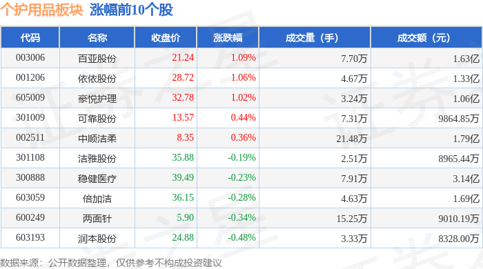 | 代码 | 名称 | 收盘价 | 涨跌幅 | 成交量(手) | 成交额(元) | | --- | --- | --- | --- | --- | --- | | 001328 | 登康口腔 | 40.26 | -0.84% | 2.25万 | 9008.93万 | | 603193 | 润本股份 | 24.88 | -0.48% | 3.33万 | 8328.00万 | | 600249 | 两面针 | 5.90 | -0.34% | 15.25万 | 9010.19万 | | 603059 | 倍加洁 | 36.15 | -0.28% | 4.63万 | 1.69亿 | | 300888 | 稳健医疗 | 39.49 | -0.23% | 7.91万 | 3.14亿 | | 301108 | 洁雅股份 | 35.88 | -0.19% | 2.51万 | 8965.44万 | | 002511 | 中顺洁柔 | 8.35 | 0.36% | 21.48万 | 1.79亿 | | 301009 | 可靠股份 | 13.57 | 0.44% | 7.31万 | 9864.85万 | | 605009 | 豪悦 ...