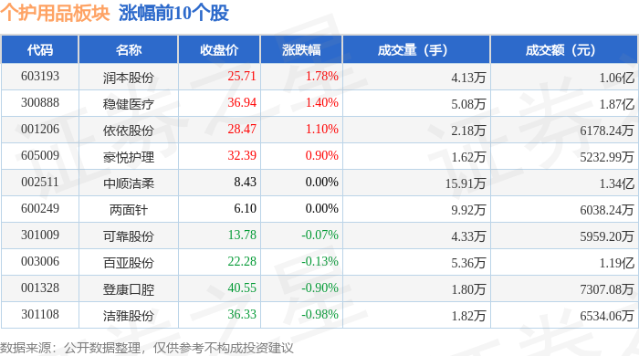 | 代码 | 名称 | 收盘价 | 涨跌幅 | 成交量(手) | 成交额(元) | | --- | --- | --- | --- | --- | --- | | 603193 | 润本股份 | 25.71 | 1.78% | 4.13万 | 1.06亿 | | 300888 | 稳健医疗 | 36.94 | 1.40% | 5.08万 | + 1.87亿 | | 001206 | 依依股份 | 28.47 | 1.10% | 2.18万 | 6178.24万 | | 605009 | 家用护理 | 32.39 | 0.90% | 1.62万 | 5232.99万 | | 002511 | 中顺洁桑 | 8.43 | 0.00% | 15.91万 | 1.34亿 | | 600249 | 两面针 | 6.10 | 0.00% | 9.92万 | 6038.24万 | | 301009 | 可靠股份 | 13.78 | -0.07% | 4.33万 | 5959.20万 | | 003006 | 百亚股份 | 22.28 | -0.13% | 5.36万 | 1.19亿 | | 001328 | 登康口腔 | ...
